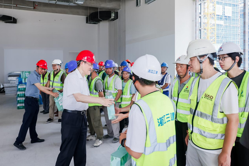 7月10日,校黨委書記任少波深入紫金港校區(qū)在建工地開展現(xiàn)場(chǎng)調(diào)研,并慰問(wèn)一線工人代表。