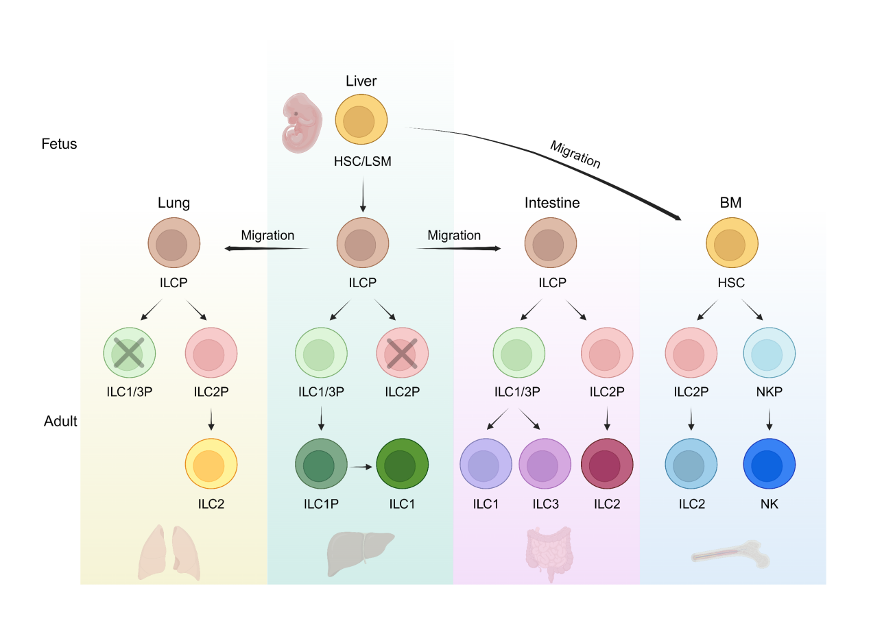 ILC是具有組織駐留特性的異質性群體(包含ILC1、ILC2和ILC3),對機體抵抗病原體、抗腫瘤及免疫調節等具有重要作用。傳統觀點認為,骨髓作為機體出生后的主要造血器官,是免疫細胞發育分化的關鍵場所。因此,研究人員長期以來主要在骨髓中尋找和鑒定ILC的前體細胞(ILC precursor, ILCP),然而亦有證據提示骨髓之外的組織中也有ILCP的存在。近年來,田志剛教授課題組發現肝臟駐留NK細胞(后續國際命名為ILC1)由肝臟原位造血前體細胞產生(Science 2021; J Exp Med 2022),提示ILC存在獨立于骨髓造血的起源路徑。