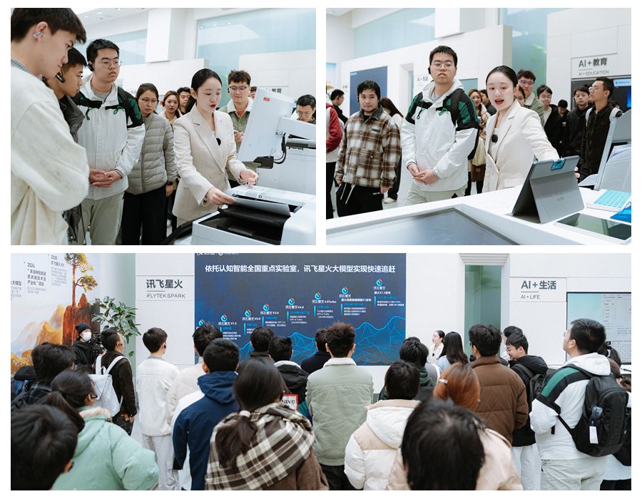 師生們還參觀了科大訊飛AI展廳,開啟了一場“沉浸式”的技術(shù)體驗之旅。展廳內(nèi),星火大模型、阿爾法蛋、AI翻譯機等核心產(chǎn)品有序陳列,每一款產(chǎn)品都直觀呈現(xiàn)了AI技術(shù)與實際需求的深度融合。同學(xué)們圍繞產(chǎn)品設(shè)計理念、AI行業(yè)應(yīng)用前景等問題進行了熱烈交流,并對訊飛能夠?qū)?fù)雜的工作簡單化、智能化、一體化,表示驚喜和由衷贊嘆。