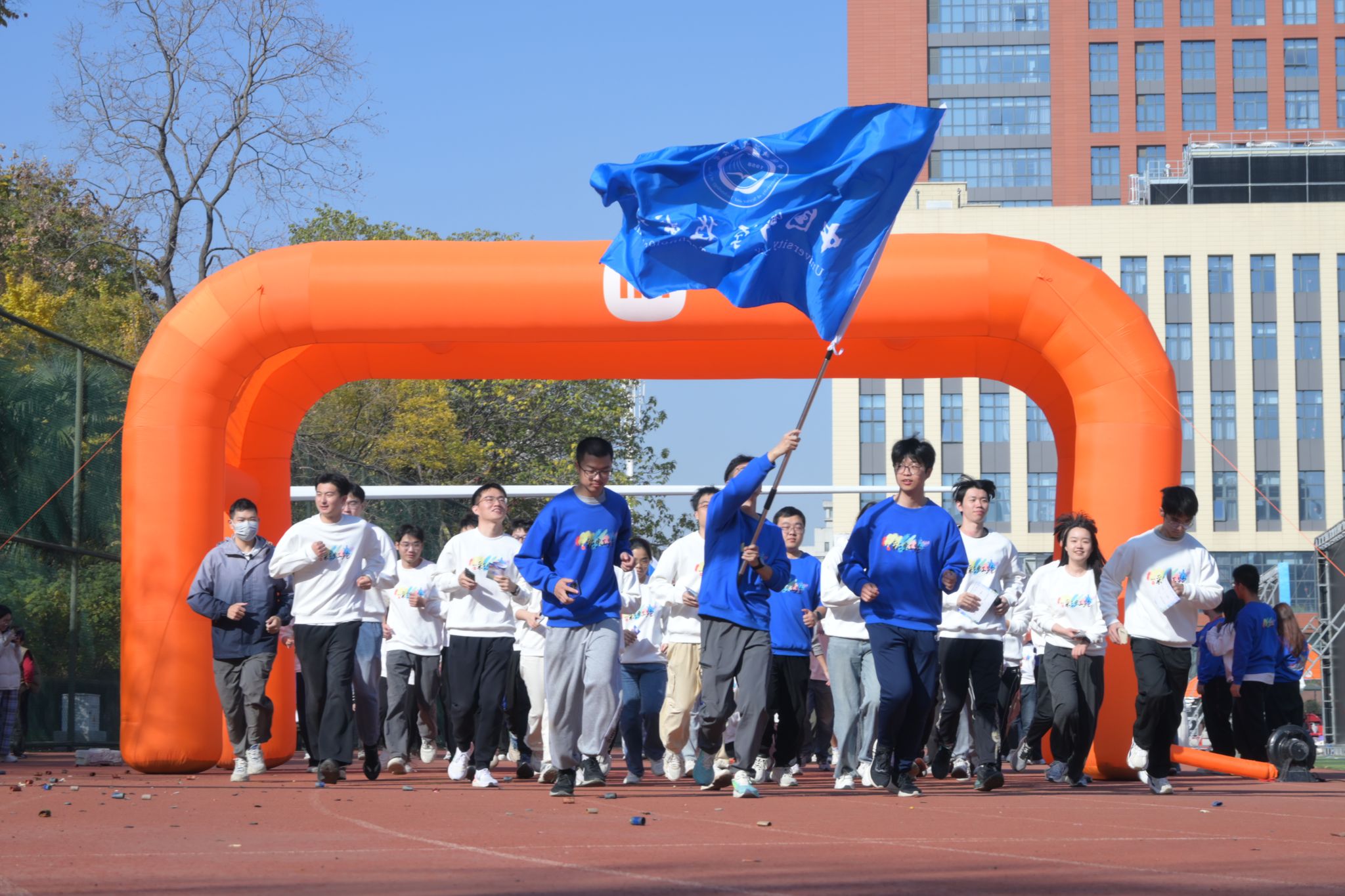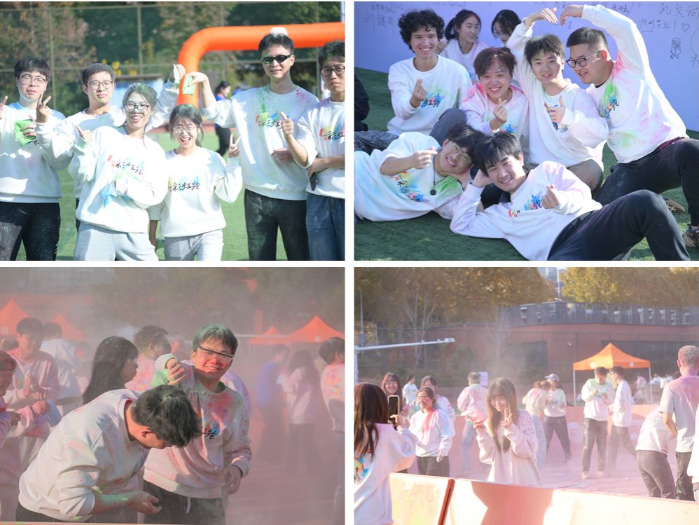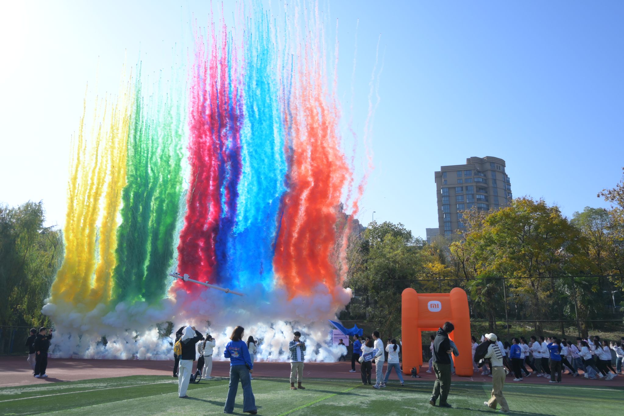 活動當天中午,上千名師生陸續抵達西區操場檢錄處,領取定制衛衣等專屬物資,并在展板上簽名留念,記錄這一充滿歡樂的時刻。隨著第一輪舞臺表演的精彩上演,現場氣氛被迅速點燃。參與者們換上統一的白色活動衛衣,精神飽滿地集結于起跑線前。起跑令下,起點處同時揚起絢麗的彩虹煙幕墻,環校彩虹跑正式拉開序幕。參與者們沿著既定路線奔跑,不僅在運動中感受活力與快樂,還在沿途設立的多個彩粉站點互動,收集不同顏色的彩粉。歡聲笑語灑滿校園道路,形成了初冬校園里一道獨特的風景線。