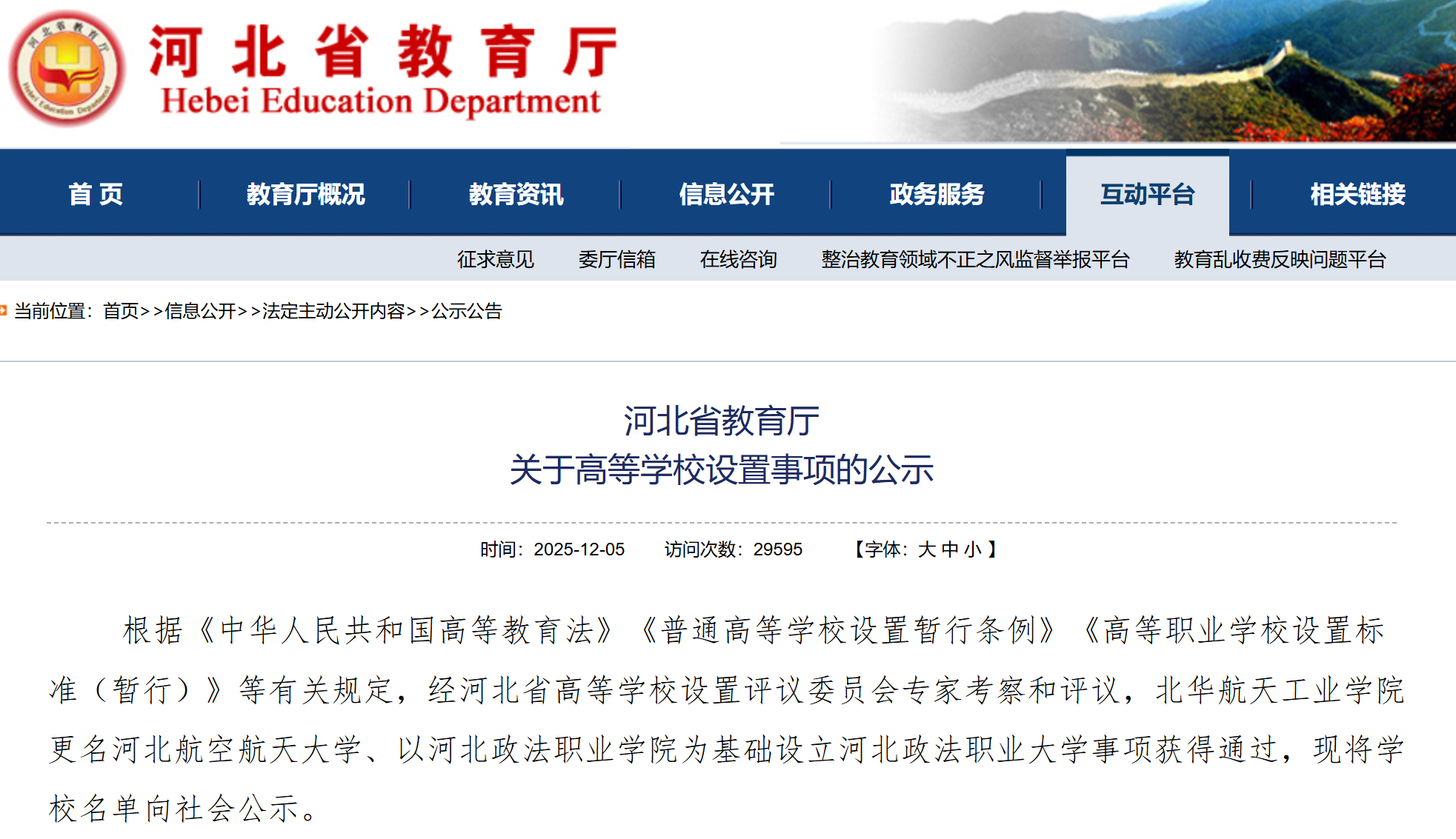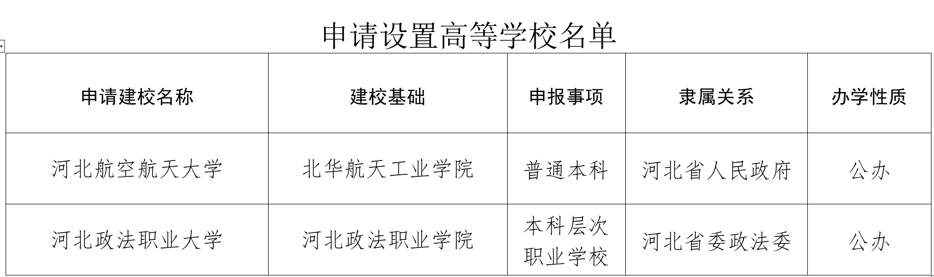 根據(jù)《中華人民共和國高等教育法》《普通高等學校設(shè)置暫行條例》《高等職業(yè)學校設(shè)置標準(暫行)》等有關(guān)規(guī)定,經(jīng)河北省高等學校設(shè)置評議委員會專家考察和評議,北華航天工業(yè)學院更名河北航空航天大學、以河北政法職業(yè)學院為基礎(chǔ)設(shè)立河北政法職業(yè)大學事項獲得通過,現(xiàn)將學校名單向社會公示。