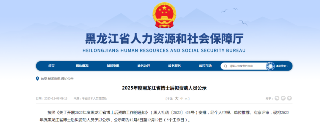 12月8日,黑龍江省人社廳網站公示2025年度黑龍江省博士后擬資助人員。20人擬獲特別資助、310人擬獲面上資助。