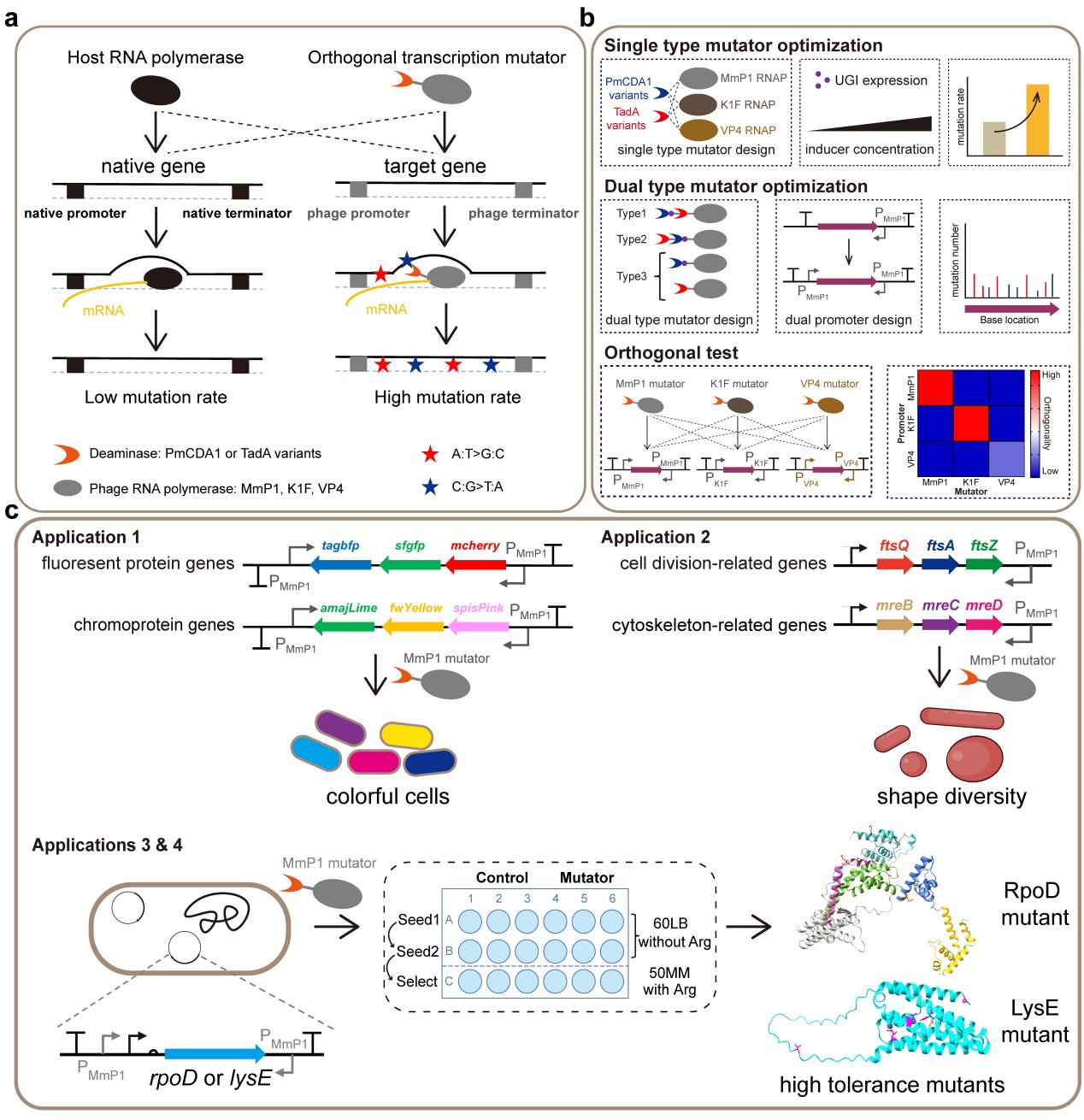 7月1日,清華大學生命學院陳國強教授團隊在《自然·通訊》(Nature Communications)發表題為“一種產生全部轉換突變的正交轉錄突變系統用于體內加速蛋白質進化”(An orthogonal transcription mutation system generating all transition mutations for accelerated protein evolutionin vivo)的研究論文,報道了一種正交轉錄突變系統(OTM)。該系統通過將三種廣宿主兼容性的噬菌體RNA聚合酶(MmP1/K1F/VP4)與兩種脫氨酶(PmCDA1和TadA變體)巧妙融合,構建了一個高效、模塊化的蛋白質進化平臺。其設計原理在于,RNA聚合酶在轉錄過程中解旋DNA形成單鏈區,而融合的脫氨酶則能對暴露的單鏈DNA進行編輯,實現C:G-T:A和A:T-G:C類型的堿基突變。該系統能在短短一天內完成蛋白質的定向進化,突變效率較自發突變提升150萬倍。