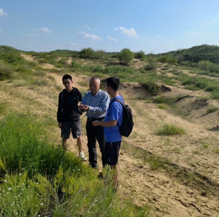 賀浪沖(中)帶領(lǐng)團隊在榆林沙蒿地采樣。受訪者供圖