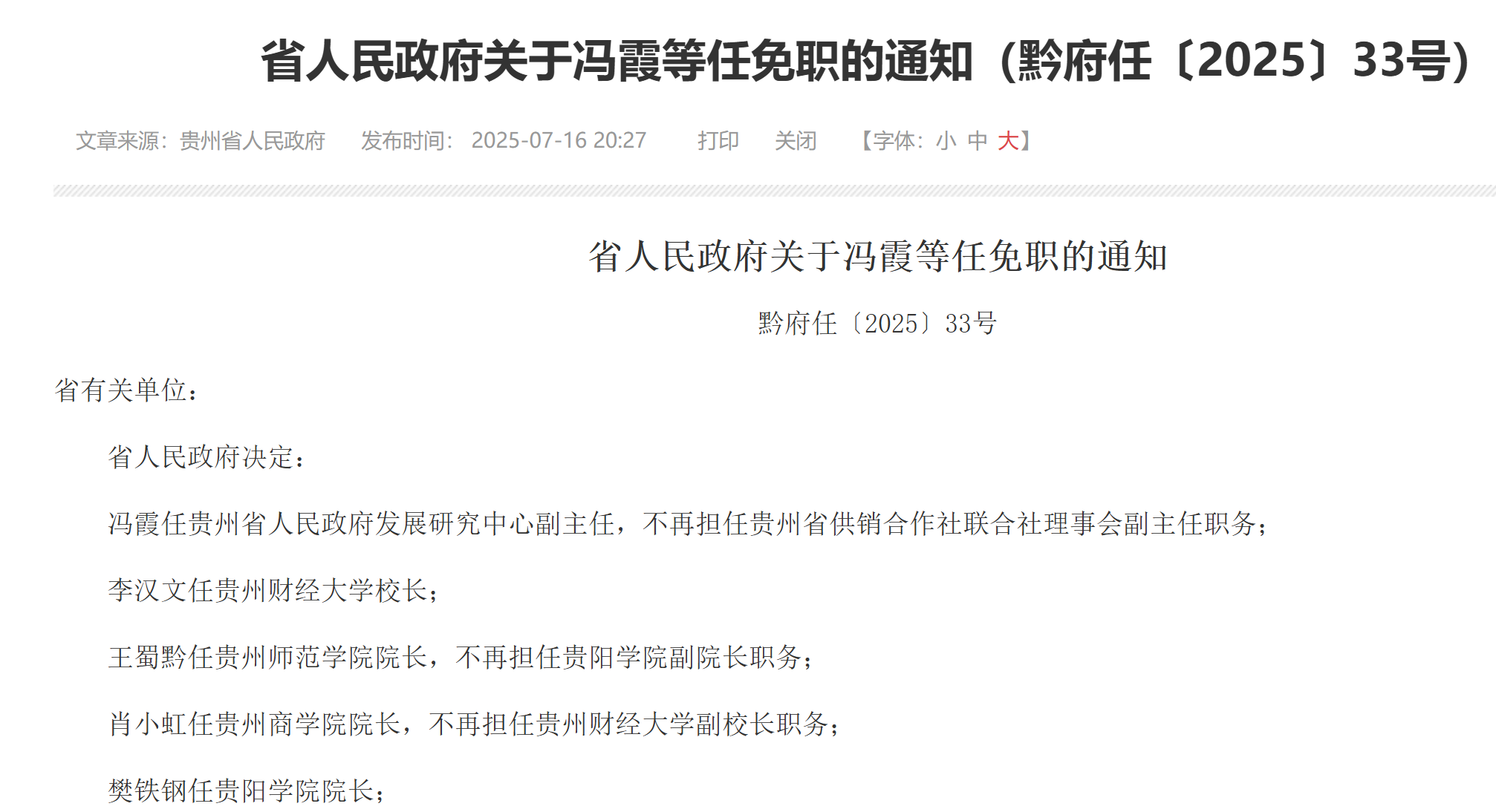 貴州省政府發(fā)布一批人事任免通知,涉及多所高校