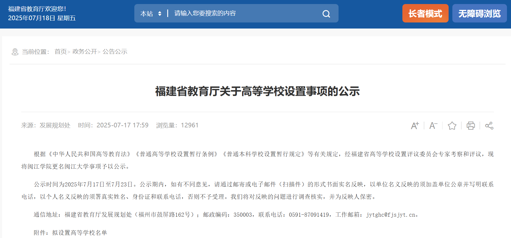 公示顯示,根據《中華人民共和國高等教育法》《普通高等學校設置暫行條例》《普通本科學校設置暫行規定》等有關規定,經福建省高等學校設置評議委員會專家考察和評議,現將閩江學院更名閩江大學事項予以公示。