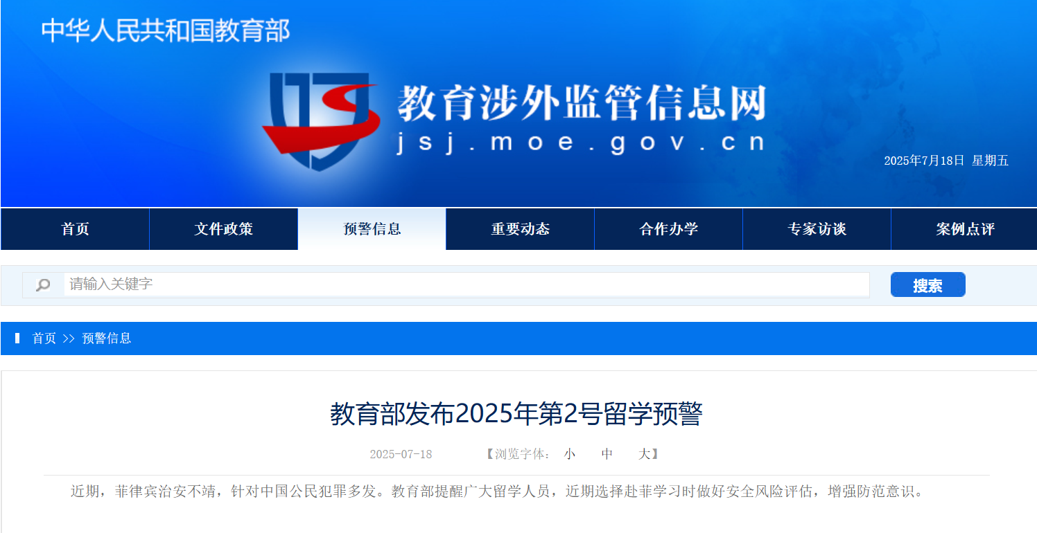 近期,菲律賓治安不靖,針對中國公民犯罪多發(fā)。教育部提醒廣大留學人員,近期選擇赴菲學習時做好安全風險評估,增強防范意識。