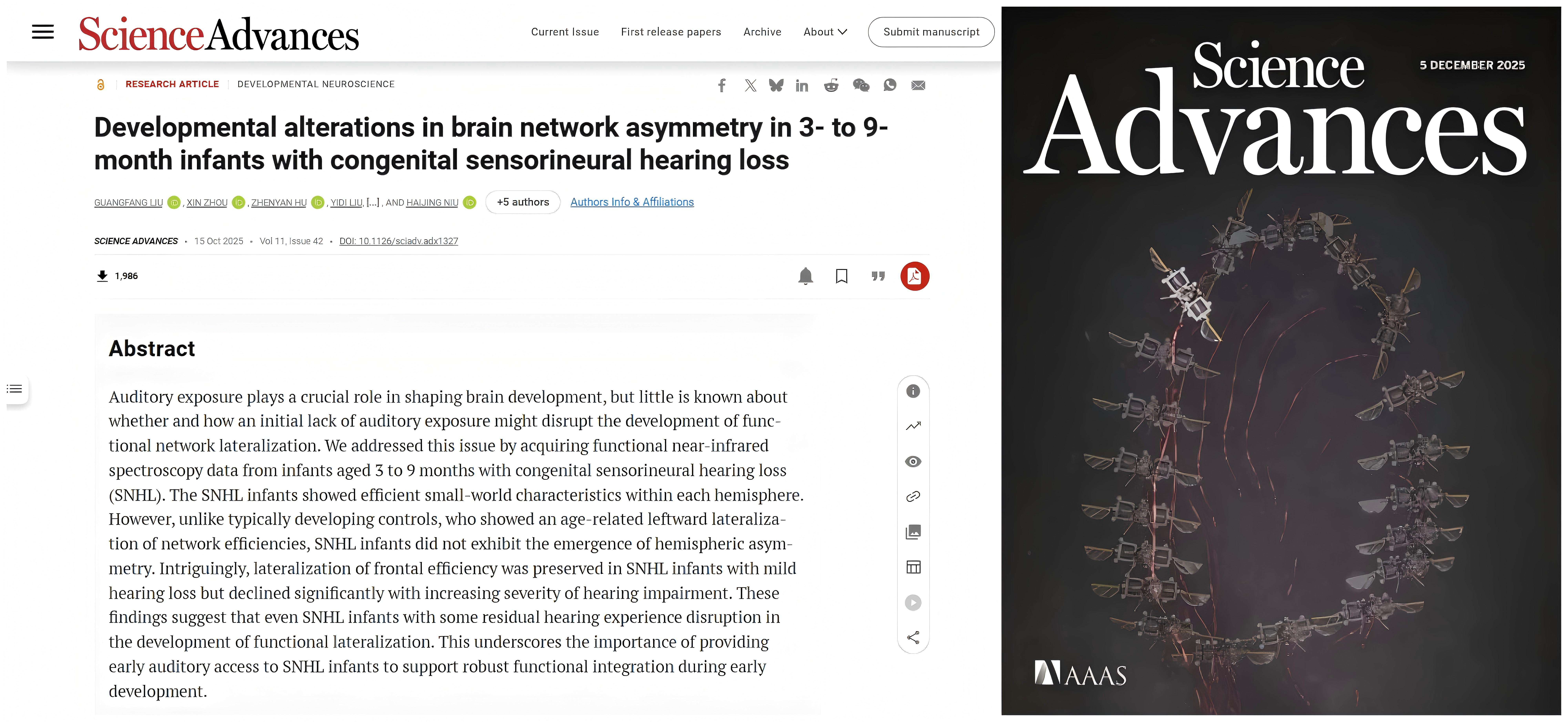 近日,北京師范大學(xué)與首都醫(yī)科大學(xué)附屬北京兒童醫(yī)院等團(tuán)隊(duì)合作,在《科學(xué)進(jìn)展》發(fā)表研究成果,揭示先天性感音神經(jīng)性聽(tīng)力損失對(duì)3至9月齡嬰兒大腦功能網(wǎng)絡(luò)偏側(cè)化發(fā)展的顯著影響,證實(shí)早期聽(tīng)覺(jué)缺失對(duì)嬰兒大腦正常發(fā)育產(chǎn)生重要影響。