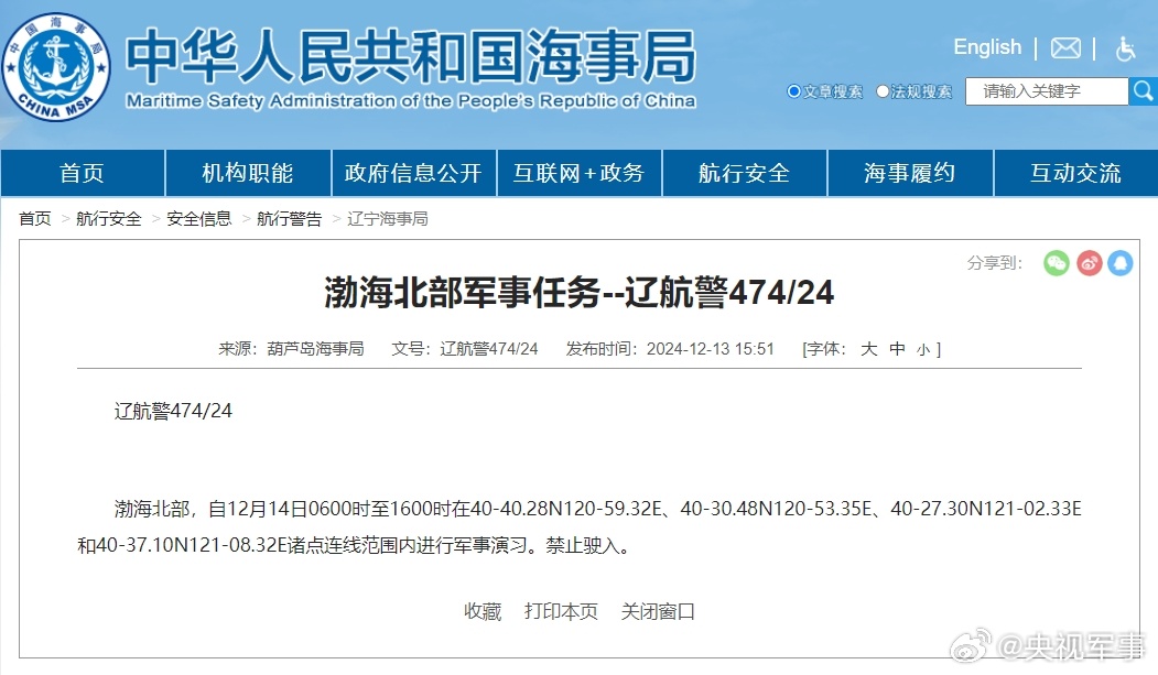 據中國海事局網站消息,葫蘆島海事局發布航行警告,12月14日6時至16時,渤海北部部分海域進行軍事演習,禁止駛入。