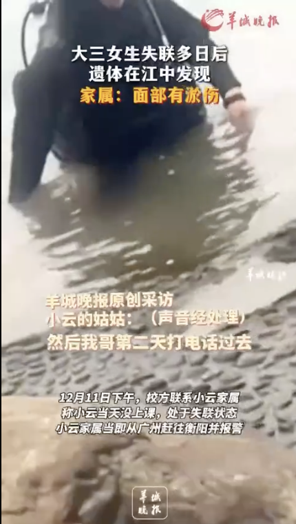12月11日下午,校方聯(lián)系小云家屬,稱小云當天沒上課,處于失聯(lián)狀態(tài)。小云家屬當即從廣州趕往衡陽并報警。從一家超市的監(jiān)控中,家屬發(fā)現(xiàn)了小云的身影,從而確定了小云的穿著。12日,在學校附近的湘江邊上,家屬找到小云的遺物,包括鞋子和圍巾。