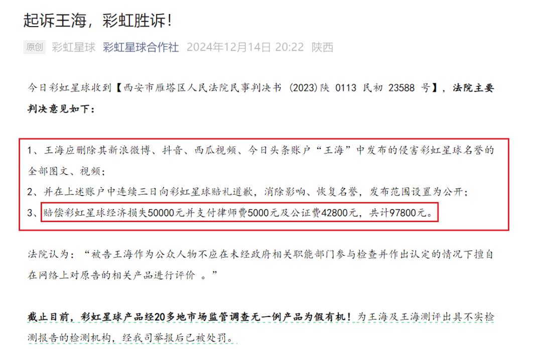 文章中還稱,截至目前,公司產品經20多地市場監管調查無一例產品為假有機。“為王海及王海測評出具不實檢測報告的檢測機構,經我司舉報后已被處罰”。