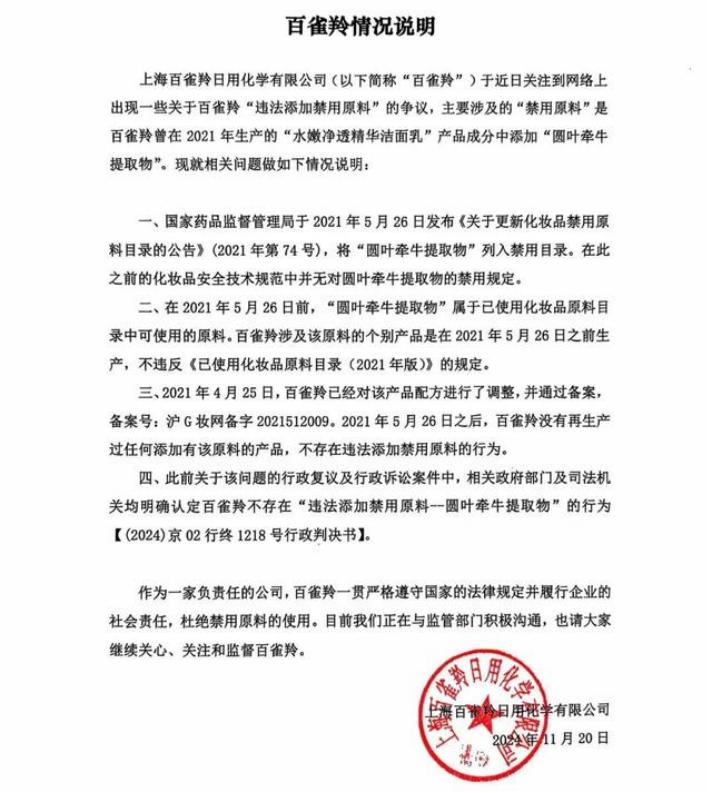 藥監部門解釋稱,舉報內容屬實并不等同于百雀羚違法,經過調查確認其無違規行為。百雀羚也解釋稱,該原料曾可使用,后來新規將其禁用。