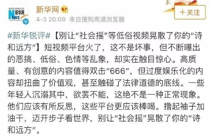 2018年4月3日,新華網點名批評“社會搖”現象,認為其敗壞了社會風氣,影響了青少年的健康成長,呼吁“別讓社會搖等低俗視頻晃散了你的‘詩與遠方’”。次日,國家廣播電視總局發布一則名為《國家廣播電視總局嚴肅處理“今日頭條”“快手”傳播有違社會道德節目等問題》的通知,表示兩家網站長期無視法規訓誡、擾亂網絡視聽,責令其立即采取整改措施,并將違規網絡主播納入跨平臺禁播黑名單,禁止其再次注冊直播賬號。
