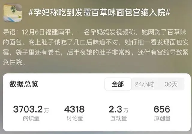 從她發出的視頻中,可以清晰地看到面包上有綠色的斑塊。此事件迅速發酵,相關話題一度沖上熱搜榜第二位,閱讀量高達數千萬。