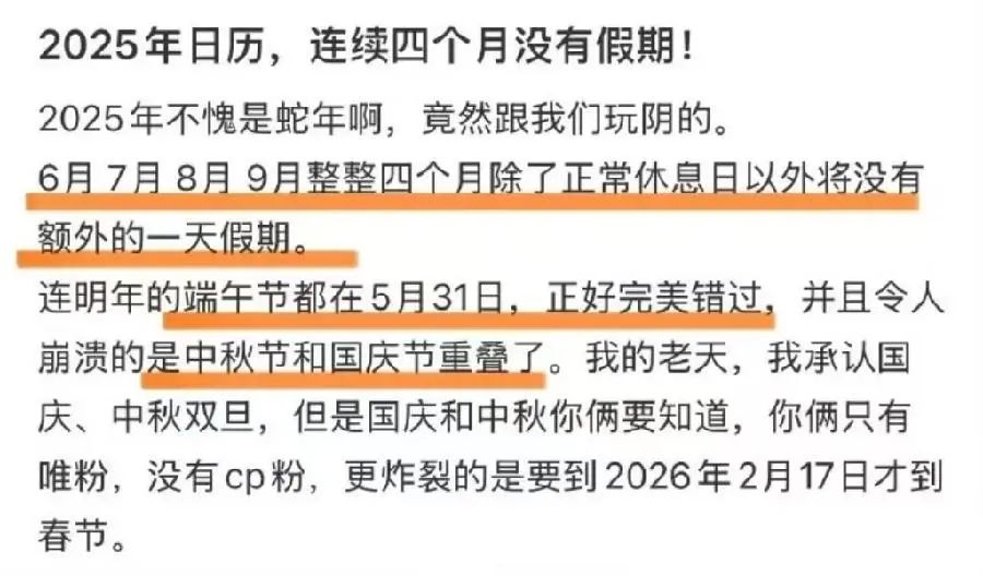 再往后看全年的假期,有網友發現,2025年中秋節在10月6日,恰逢國慶長假,而端午節在5月31日,這意味著明年6月-9月除周末外,整整4個月都沒有法定節假日。