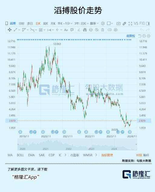 滔搏的股價也從2021年一度漲至12港元/股的價格一路下跌,至今已不超過3港元/股。