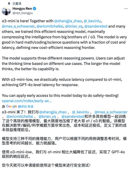 他隨后在推特上發文,重點講解o3 mini的卓越性能,包括其高效性、成本效益以及靈活可調的推理時間。還特別提到了幾位參與o3-mini研發的核心成員,向他們致敬。