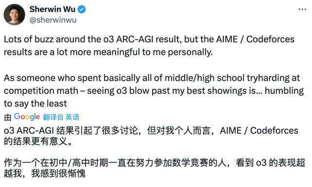 OpenAI API工程主管Sherwin Wu對此深表贊同,Sherwin提醒社區:比起ARC-AGI測試,o3在編程和數學上的突破才更值得關注——o3的編程水平已經超越了自己,而o3能答對四分之一的前沿數學題目自己更是一道都解不出。