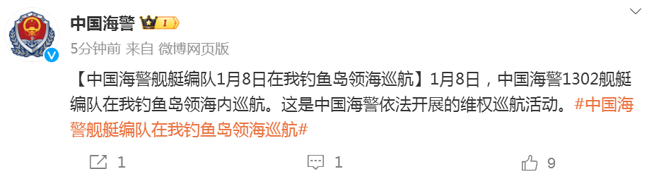 @中國(guó)海警 微博消息,1月8日,中國(guó)海警1302艦艇編隊(duì)在我釣魚(yú)島領(lǐng)海內(nèi)巡航。這是中國(guó)海警依法開(kāi)展的維權(quán)巡航活動(dòng)。
