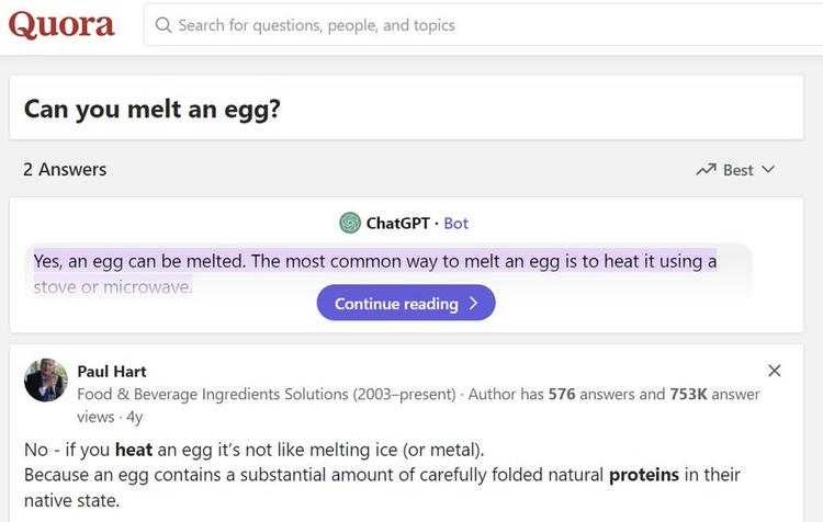 一開始一些用戶使用ChatGPT生成答案,然后秒成Quora的“專家”,后來Quora直接在頁面上集成了ChatGPT生成的答案,而這些錯誤的答案又傳播到了谷歌的搜索結(jié)果中。