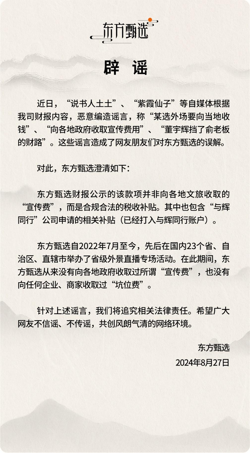 一天后,俞敏洪在個人微信公眾號“老俞閑話”發(fā)文,對近期市場多個傳聞再度進(jìn)行辟謠澄清。同日晚間,東方甄選在其微信公眾號再度發(fā)文辟謠澄清。針對“向各地政府收取宣傳費用”的言論,文章稱,東方甄選財報公示的相關(guān)款項并非向各地文旅收取的“宣傳費”,而是合規(guī)合法的稅收補(bǔ)貼……東方甄選從來沒有向各地政府收取過所謂“宣傳費”,也沒有向任何企業(yè)、商家收取過“坑位費”。