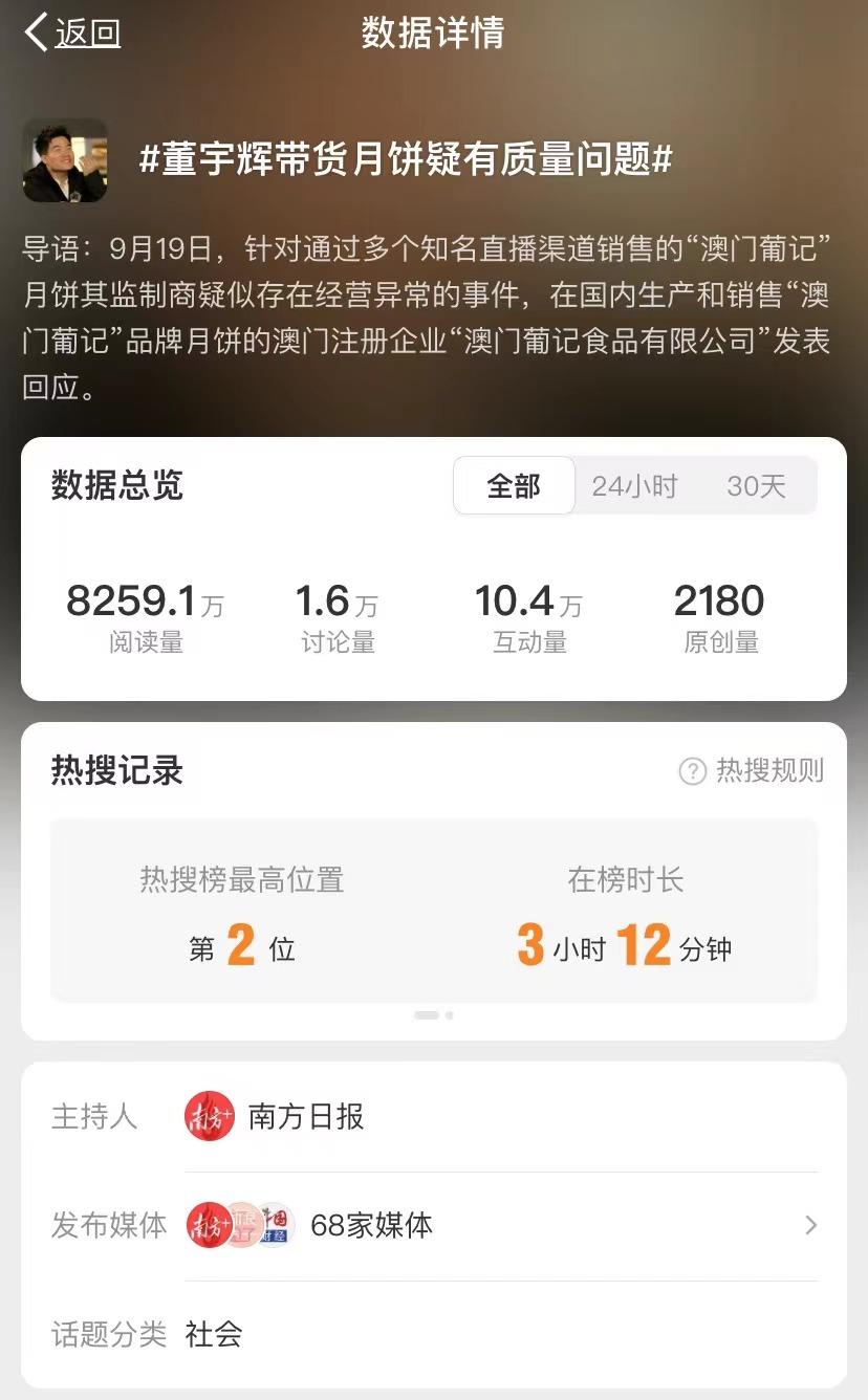 當(dāng)然,除此之外,近日與輝同行的品控問題也飽受爭議。有媒體報道稱,于與輝同行直播間售賣的“澳門葡記”月餅監(jiān)制商疑似經(jīng)營異常。盡管澳門葡記食品有限公司表示,媒體誤將香港注冊的“澳門葡記食品有限公司”錯認(rèn)為“澳門葡記月餅”的監(jiān)制商。公司在澳門有真實有效的商標(biāo)注冊,且與珠海生產(chǎn)商有授權(quán)委托合同。但此事仍在不斷發(fā)酵。