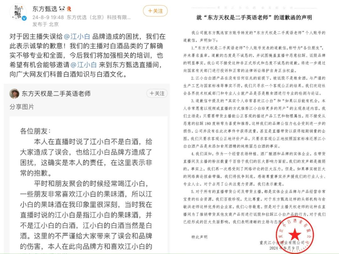 很快,東方甄選主播天權(quán)發(fā)布道歉信,稱其在直播時說了江小白不是白酒,給大家造成了誤會,也給江小白品牌方造成了困擾,隨后,東方甄選官方微博也發(fā)文表達(dá)歉意。