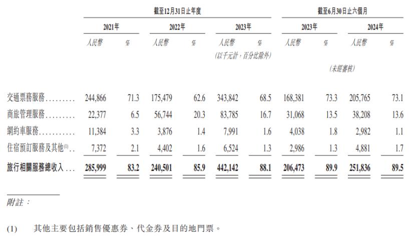 其中,交通票務服務占旅行相關服務收入的60%以上,這部分收入主要為機票及火車票預訂、配套增值旅游服務套餐及會員服務。