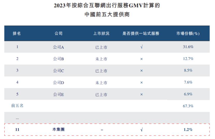 按2023年綜合互聯網出行服務GMV計,中國前五大提供商約占總市場規模的67.3%。其中,活力集團以1.2%的市場份額排在11名,不及同行上市公司攜程(公司A)、同程旅行(公司C)及華住集團(公司E)。