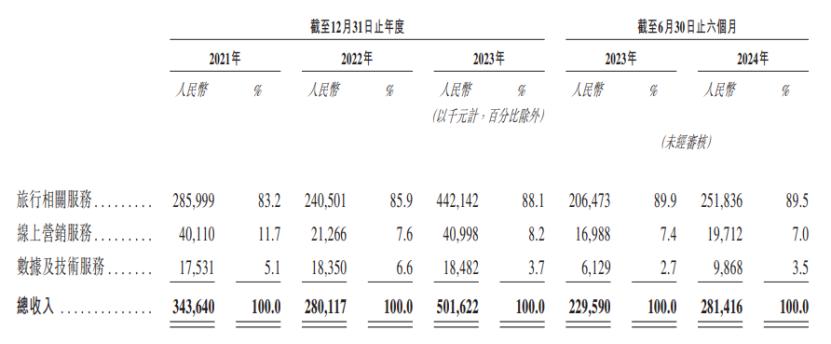 招股書顯示,2021年、2022年、2023年及2024年1-6月(簡稱“報告期”),旅行相關服務的收入占公司總收入的80%以上,而線上營銷服務、數據及技術服務的收入占比較低。
