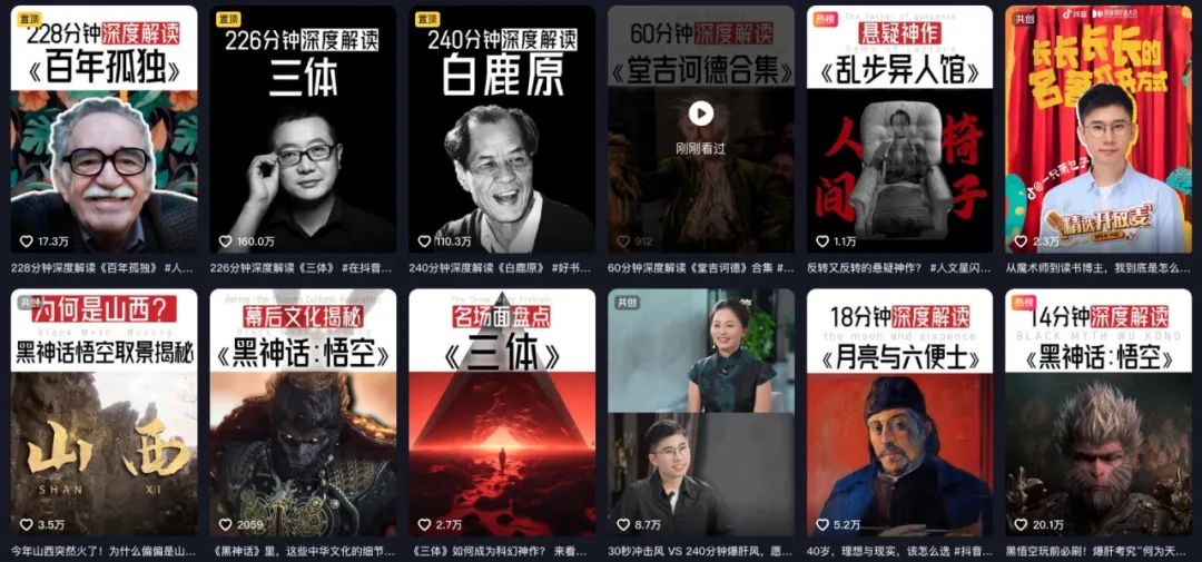 人們曾無數次想象過《紅樓夢》的后四十回,正如“一千個讀者心中會有一千個哈姆萊特”,經典著作里究竟還有多少“隱秘和偉大”?在DY上,有的讀書博主沉醉懸疑和科幻,拆解偉大作家的想法和腦洞;,有的博主則迷戀名著的魅力將大部頭經典講得通俗易懂,挖掘古典作品在當代的現實意義。