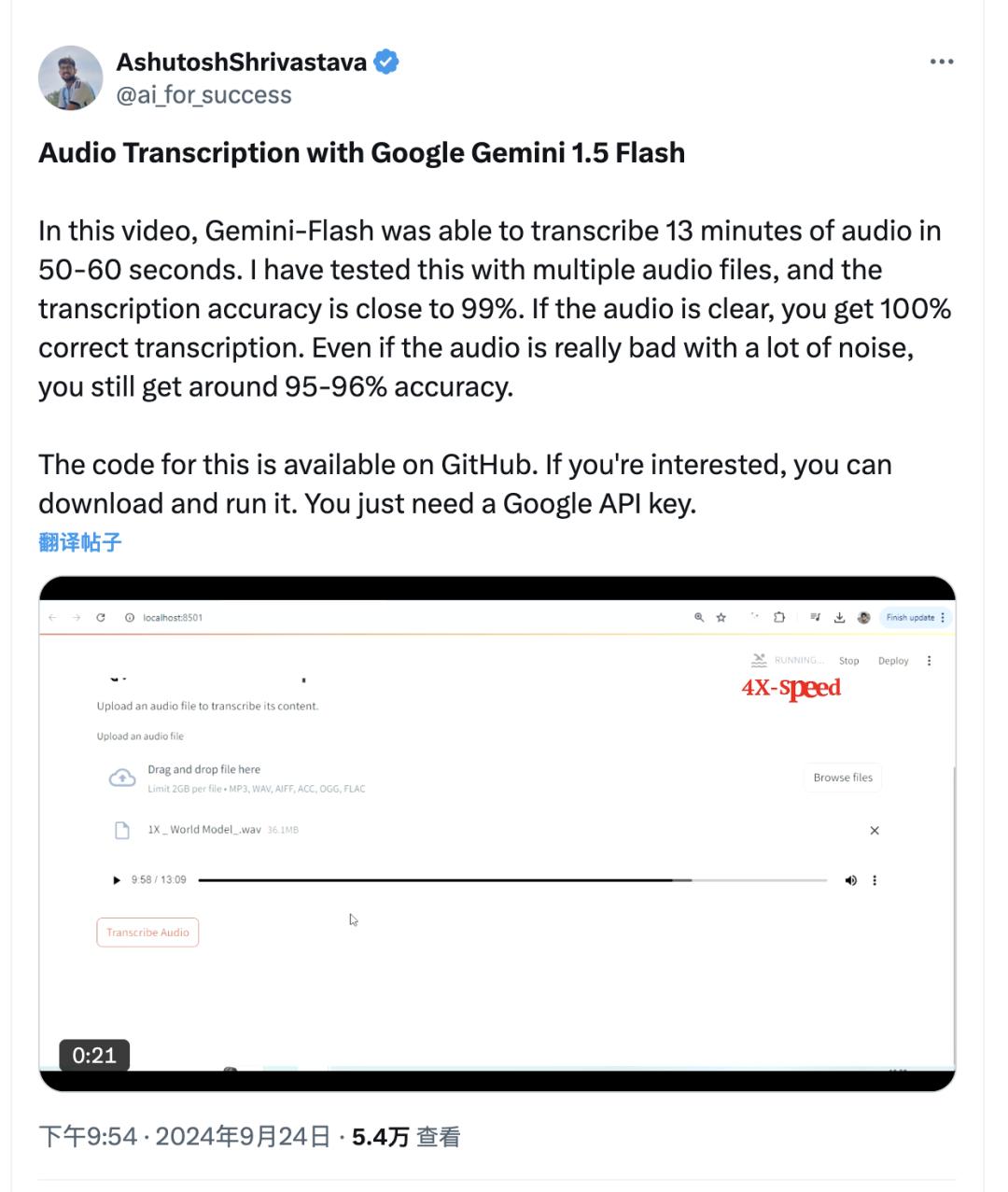 X 上的 AshutoshSrivastava 就表示,他使用 Google Flash 構建了一個應用,能夠在 1 分鐘內轉寫 13 分鐘的長音頻,且準確度很高(且免費)。在另一個應用中,他表示目標探測功能的表現也很不錯。