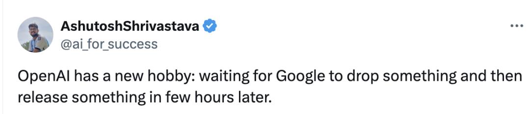 X 上有用戶不禁感嘆,OpenAI 已經養成了一個新愛好。等著 Google 發布一個更新,幾個小時后馬上發布一個更新。