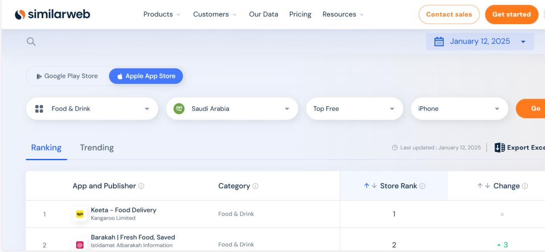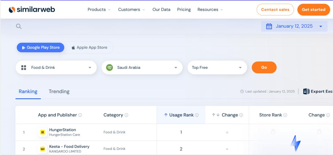 據(jù)悉,目前利雅得外賣市場日均訂單量在50萬左右,Keeta的日均單量約為10萬單,市占率約為兩成。截至1月12日, Keeta在沙特谷歌飲食類應(yīng)用榜單上位居第二,僅次于成立于2012年的外賣巨頭HungerStation;而在蘋果應(yīng)用榜單上則高居榜首。