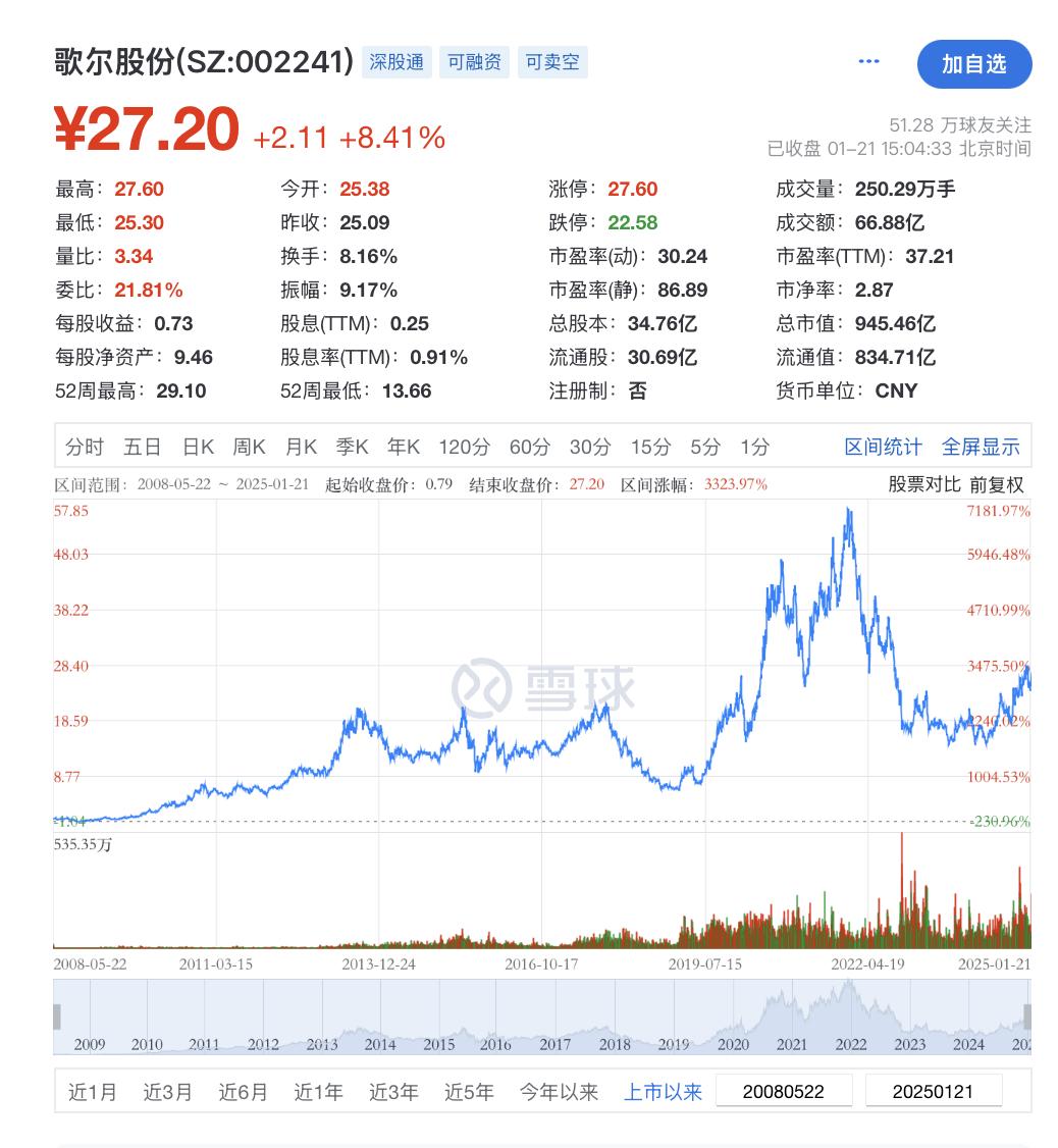 自2010年打入“果鏈”后,歌爾股份股價、業績雙雙駛入快車道。2021年前后,其股價一度接近60元/股,市值最高更是突破2000億元。截至1月21日收盤,歌爾股份漲8.41%報27.20元/股,總市值945.46億元。