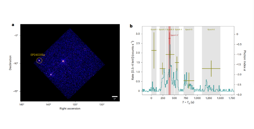 ??新華社北京1月23日電(記者張泉、張建松)我國“天關”衛星(愛因斯坦探針衛星)觀測到一例產生于約125億光年之外的伽馬暴EP240315a,這是人類首次探測到宇宙早期爆發現象的軟X射線信號,將為開展早期宇宙相關研究開啟一扇新窗口。相關成果論文23日在國際學術期刊《自然·天文》在線發表。