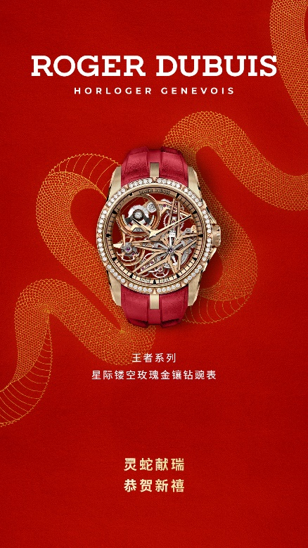 羅杰杜彼RogerDubuis標志性的五芒星元素經過重新設計懸浮于表盤中,玫瑰金表殼鑲飾60顆圓形切割鉆石并搭配一條紅色壓紋小牛皮表帶,聚焦新春時刻。