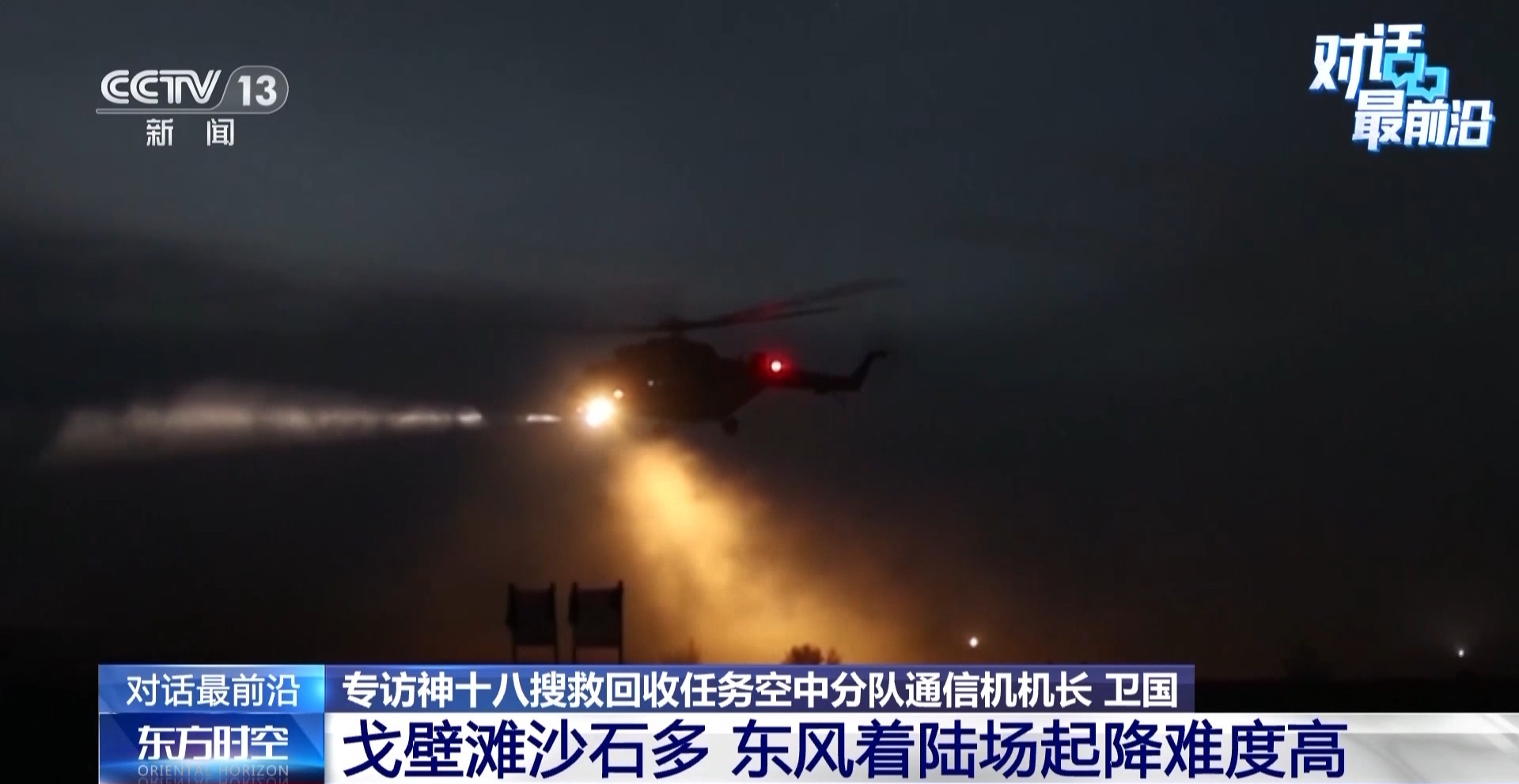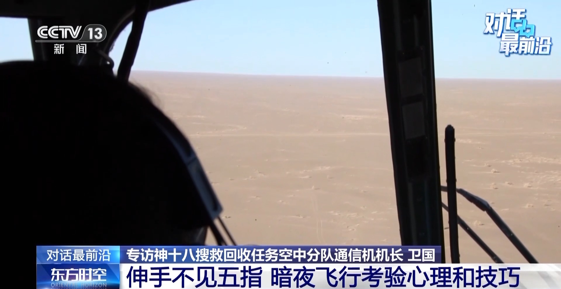 神舟十八號(hào)搜救回收空中分隊(duì)通信機(jī)機(jī)長(zhǎng) 衛(wèi)國(guó):我們通過(guò)夜視儀,初步判斷地面的地貌和地形有沒(méi)有起伏,有沒(méi)有山丘、湖泊,包括大戈壁上梭梭林特別多。梭梭林最高有兩米多的,我們最怕它們撞到尾槳上,因?yàn)槲矘母叨缺容^低。