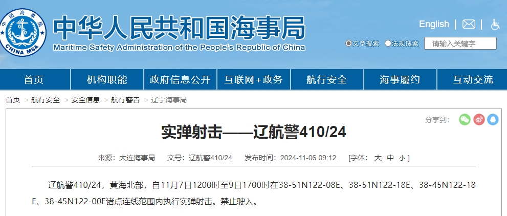 據中國海事局網站消息,大連海事局發布航行警告,黃海北部,自11月7日12時至9日17時在38-51N122-08E、38-51N122-18E、38-45N122-18E、38-45N122-00E諸點連線范圍內執行實彈射擊。禁止駛入。