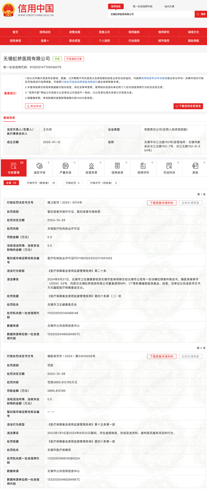 處罰決定日期為2024年10月28日的錫yb罰字【2024】第24010006號行政處罰決定書顯示,無錫虹橋醫院有限公司違法事實為:“2022年1月1日至2024年9月22日期間,存在虛假就醫、偽造變造資料、虛構醫藥服務項目的行為。”該公司被處以罰款58958121.95元。