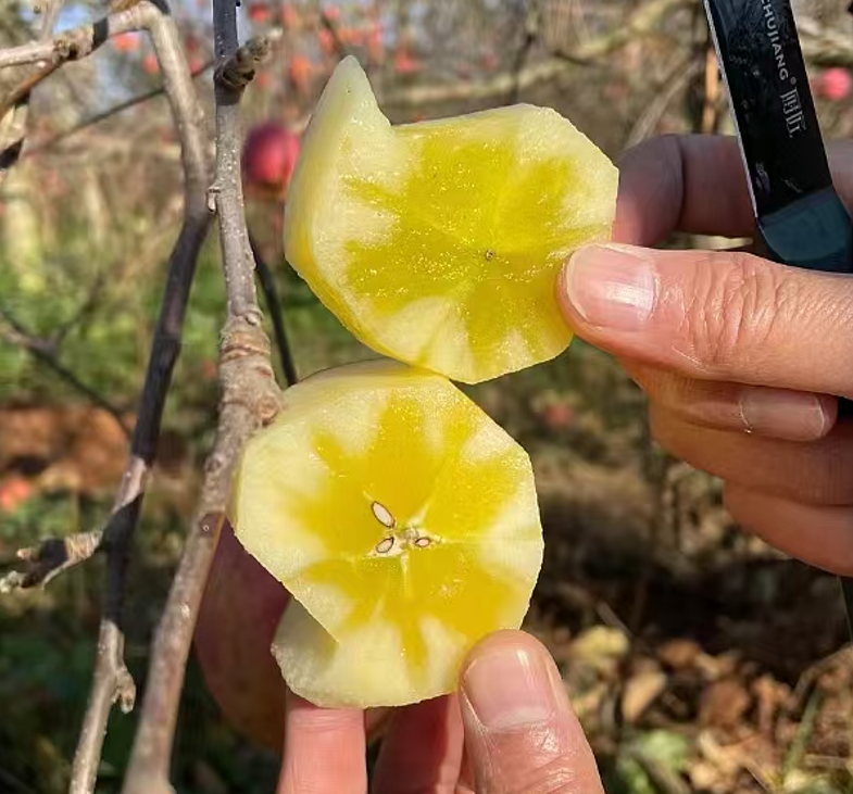 再過一段時間,等溫度逐漸下降,溫差也一點點變大的時候,昭通的丑蘋果會沉淀出像花瓣般的冰糖心。