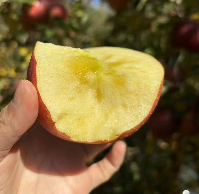 由于昭通地區晝夜溫差巨大,使得蘋果產生了糖分自然凝結,剖開后會發現如蜂蜜般的結晶,輕咬一口會發現爽脆清甜。不是所有的蘋果都有結晶,但不影響口感。