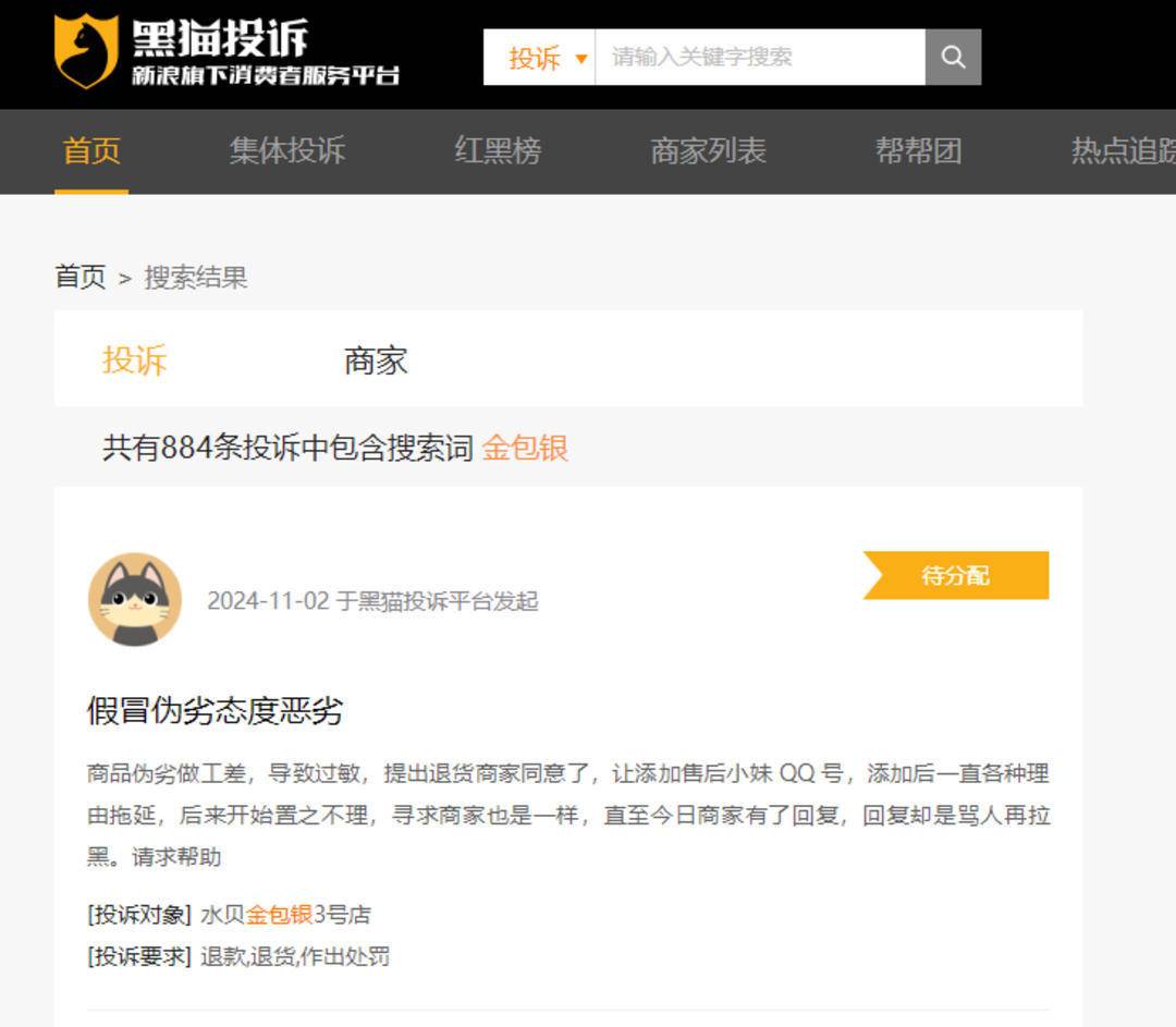 記者在黑貓投訴平臺上搜索關鍵詞“金包銀”發現,截至11月5日,與該關鍵詞相關的投訴已達884條。多數投訴與“假冒足金飾品”“掉色”“含金量不足”“虛假宣傳”等問題相關。一資深黃金從業人員向記者表示,“金包銀”飾品制造門檻較低,因此市場比較混亂,可以說魚龍混雜,產品質量參差不齊。