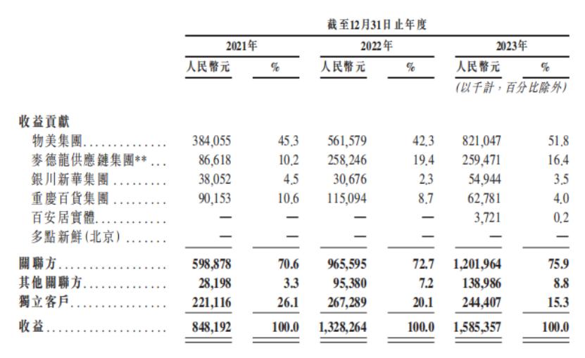 招股書顯示,過去三年來自物美系(即物美集團、麥德龍中國實體、重慶百貨集團、銀川新華集團)的收入分別約7.09億元、10.69億元和13.11億元,在多點Dmall整體營收中的占比分別是67.9%、71.3%及74.9%,逐年增加。