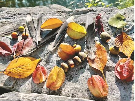 天氣未涼時,唐小水和媽媽去玄武湖公園“撿秋”。她們撿來了酡紅的欒樹果、血紅的雞爪槭葉、秋香色的海棠果,被切葉蜂裁走兩個半圓的碧綠的烏桕葉,按顏色的漸變把它們擺放在路邊的大石頭上。