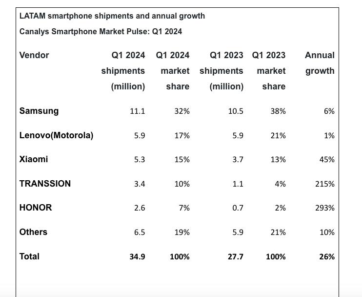 2024年一季度,拉美手機市占率前五席中,除三星占據榜首外,2-5席依次是摩托羅拉、小米、傳音、榮耀。