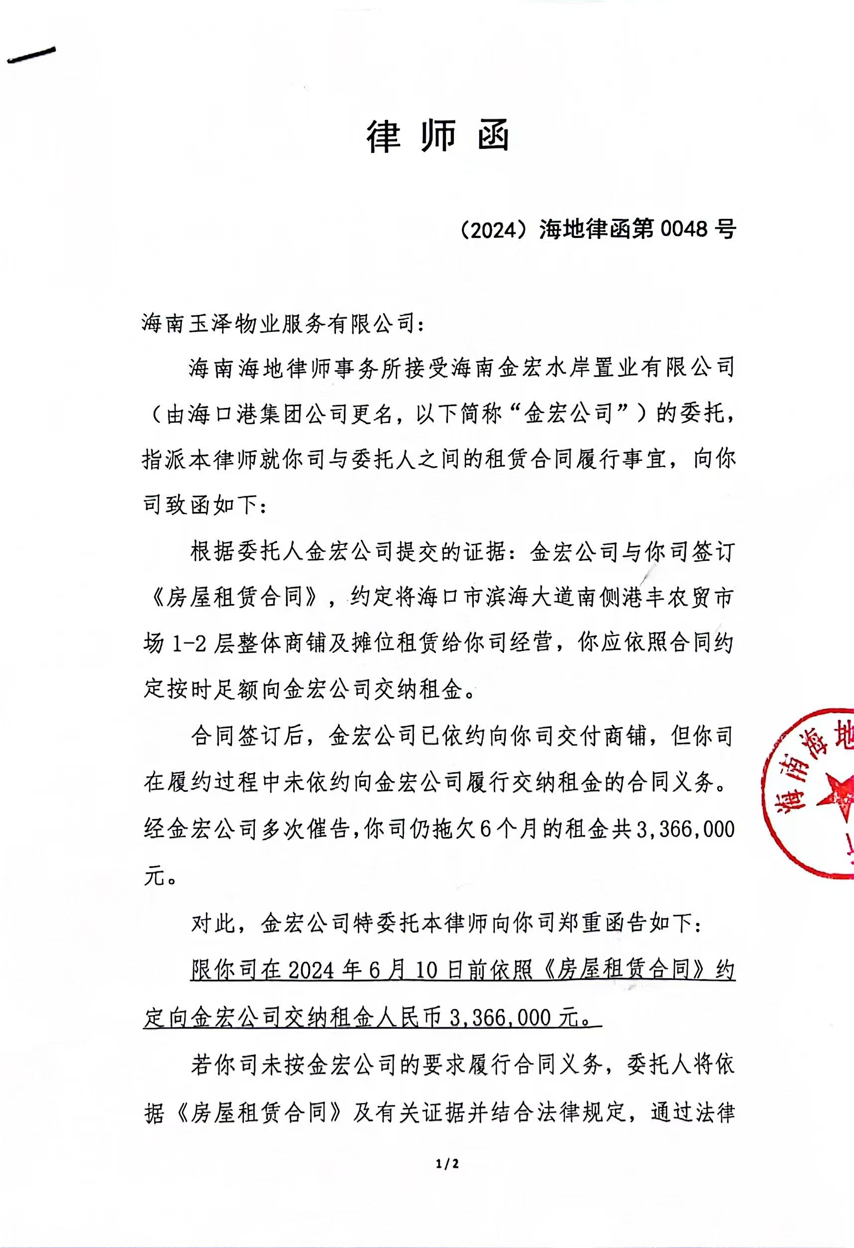 今年6月,更名后的海口港集團公司向海南玉澤物業(yè)公司發(fā)律師函,催繳其拖欠的300余萬元租金。