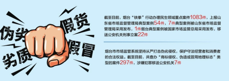 截至目前,煙臺“鐵拳”行動辦理民生領(lǐng)域重點案件1083件,上報山東省市場監(jiān)督管理局典型案例54件,7件典型案例被山東省市場監(jiān)督管理局采用發(fā)布,1件煙臺典型案例被國家市場監(jiān)管總局采用發(fā)布,移送公安機關(guān)刑事立案22件,嚴(yán)厲懲治了各類違法行為,不斷提高人民群眾獲得感幸福感安全感。