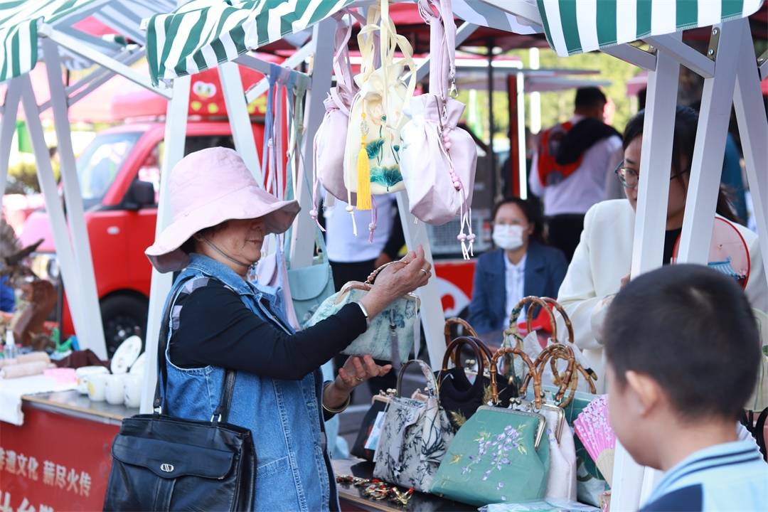攤主巫女士告訴記者,她是南寧花鳥市場的商戶,她在攤位展示了非遺刺繡技藝的手提包,不少游客紛紛前來詢價購買,或是直接到店鋪學習了解非遺刺繡技藝。