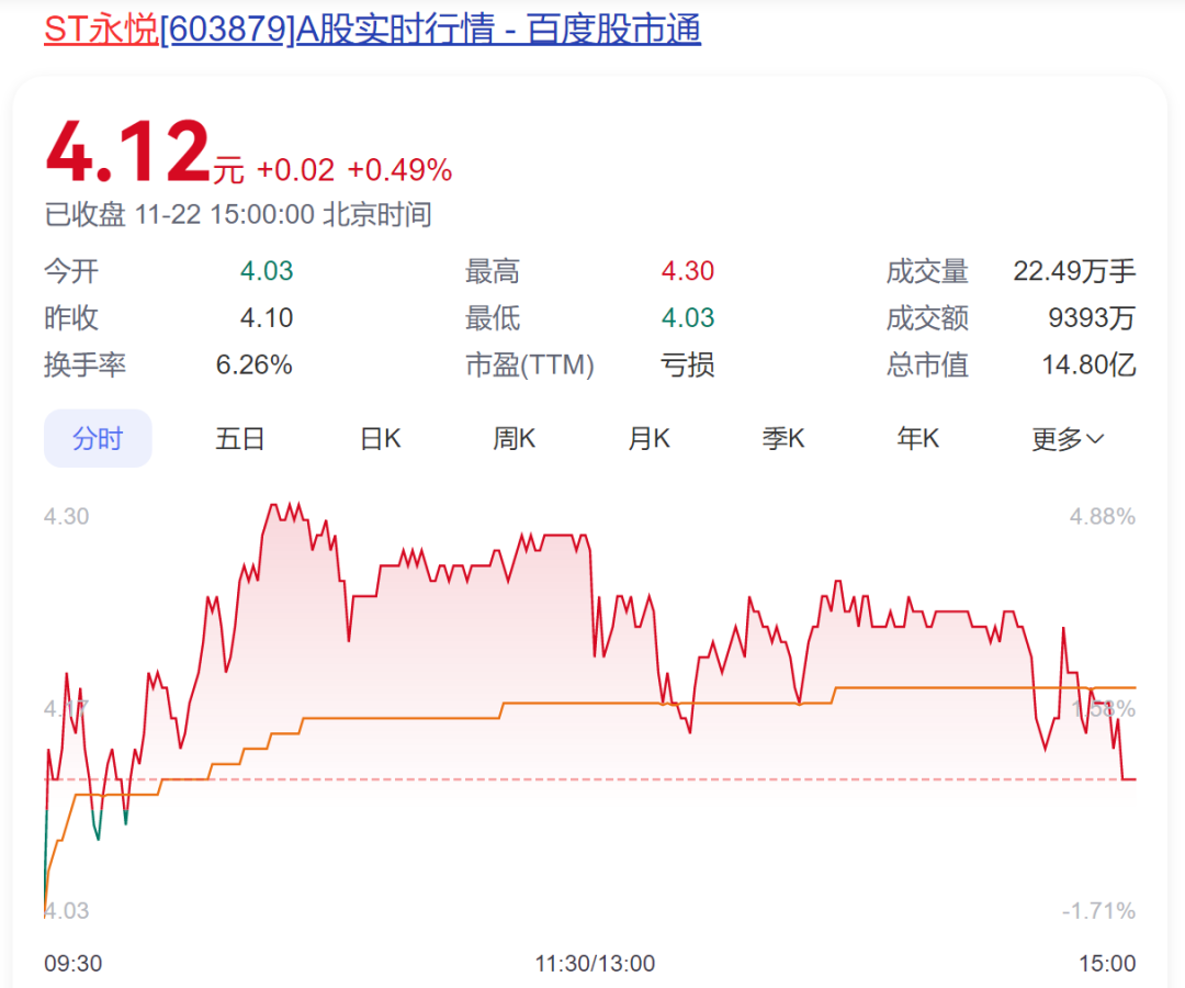 從二級市場看,近段時間,ST永悅股價漲幅明顯。近4個交易日累計漲幅超過15%,若把時間拉長,10月23日至今,漲幅超過67%,最新報收4.12元/股,總市值為15億元。